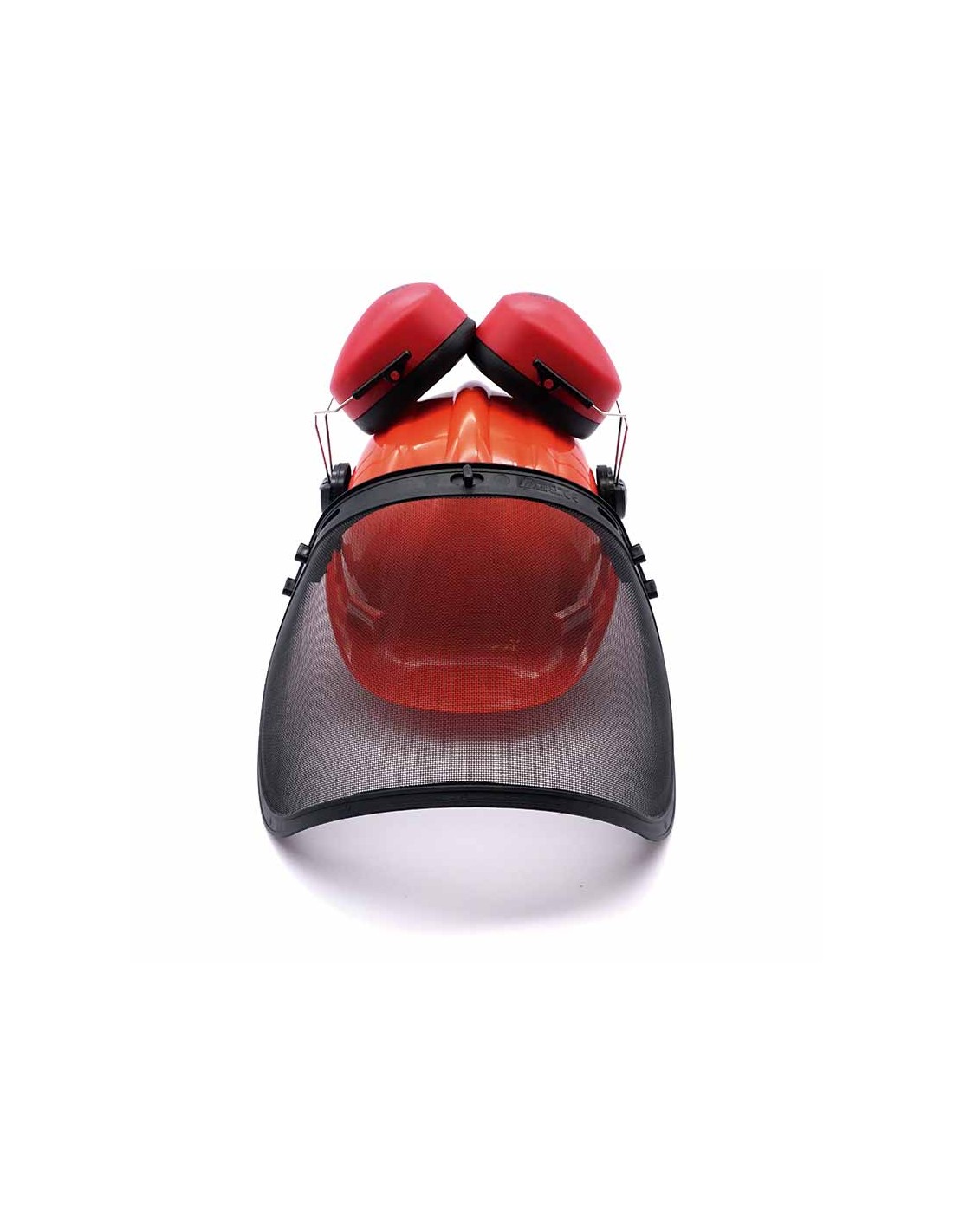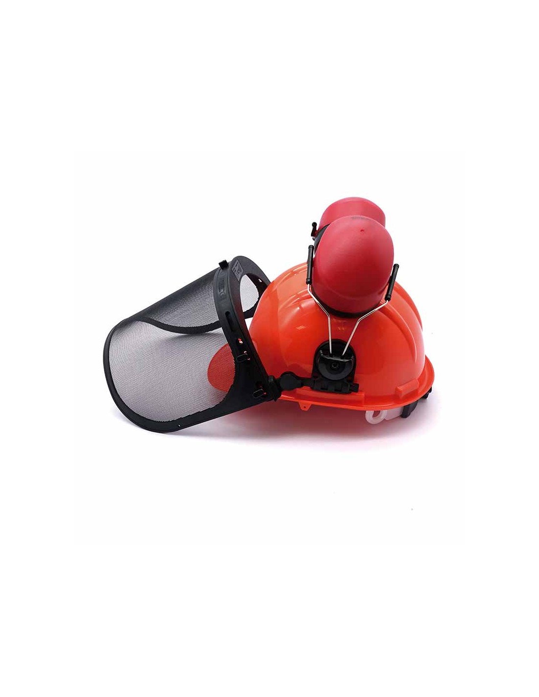 Kit forestal 3 en 1 Safetop con casco protector, visor de malla metálica abatible y orejeras auditivas. Protección integral para trabajos con desbrozadora, motosierra y jardinería.