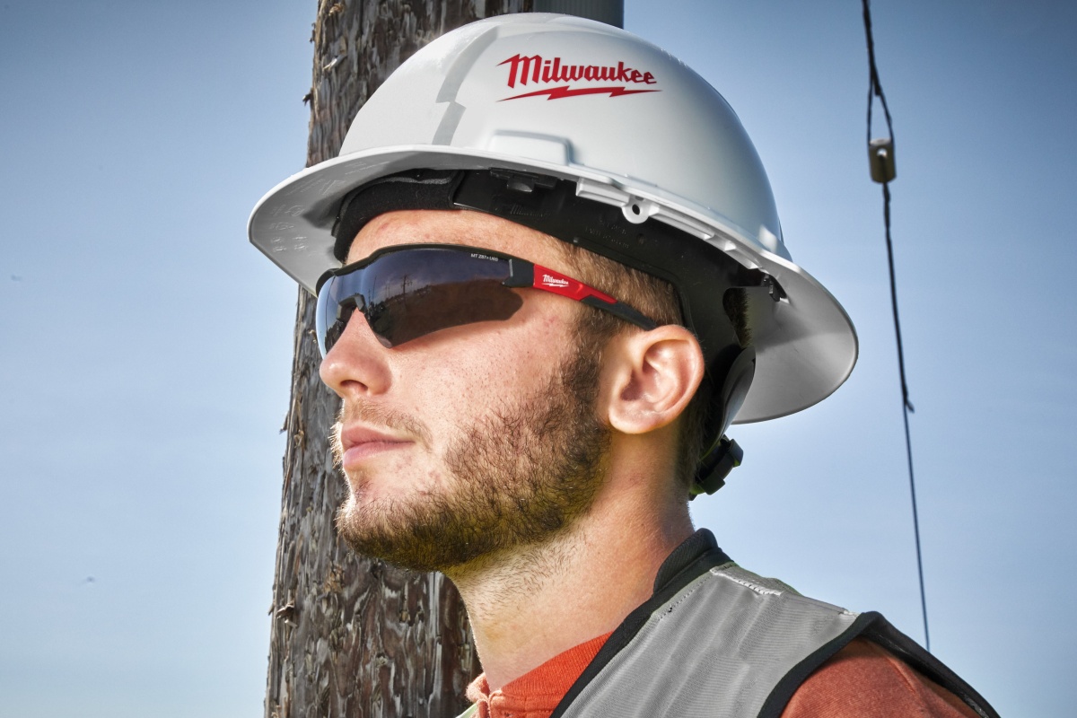 Gafas de seguridad Milwaukee con lentes antivaho y antirrayaduras, disponibles en varios colores de cristal para adaptarse a diferentes condiciones de luz y trabajo.