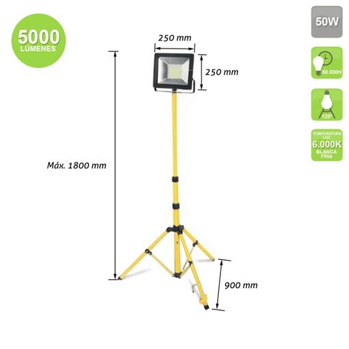 El proyector LED con trípode 50 W es una solución versátil y potente de iluminación para entornos profesionales y exigentes. Con un flujo luminoso de 5000 lúmenes y una luz blanca fría de 6400 K, proporciona una iluminación clara y homogénea, ideal para trabajos de construcción, reformas, mantenimiento y zonas exteriores.