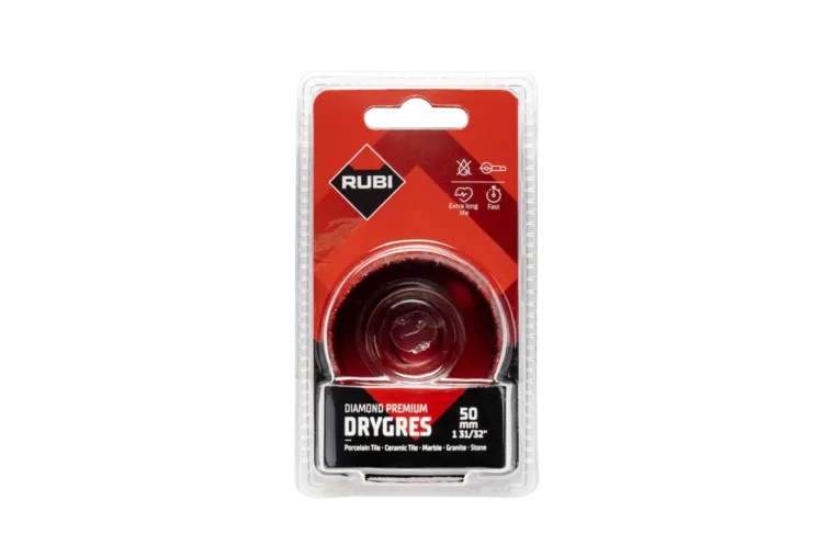 La broca DRYGRES Premium Ø50 mm de RUBI está especialmente diseñada para realizar perforaciones de gran diámetro en seco sobre materiales cerámicos de alta dureza. Gracias a su diamante de alta calidad y a la tecnología de la gama Premium, ofrece mayor velocidad de corte y una vida útil superior, incluso en gres porcelánico.