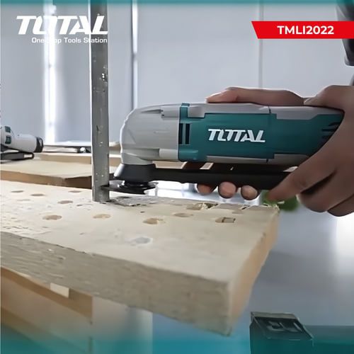La multiherramienta Total TMLI2022 20 V es una herramienta eléctrica sin cable diseñada para realizar una amplia variedad de trabajos como corte, lijado, raspado y desbaste en materiales como madera, metal, yeso o plástico.